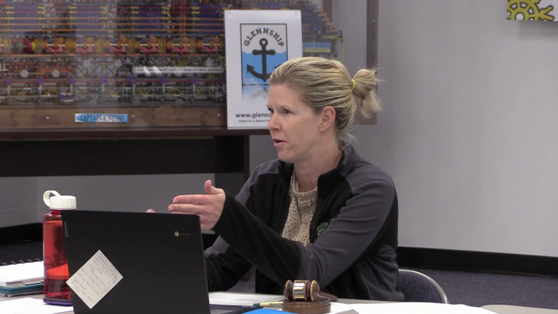 School Board Chair Kristen Pence (above) asked if the WCPS procedure would differ from a challenge that a parent might make to a book that he or she objects to and wants to be removed from a school. And she asked if the new procedure would just address how a parent would alert WCPS staff to potential sexually explicit content in instructional material that might need to be listed online.