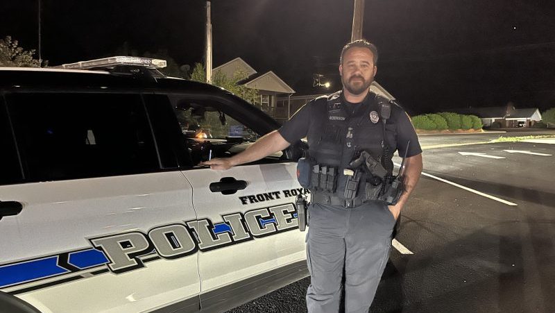 Officer Robinson, a member of the Front Royal Police Department, escorting the players, stands beside an FRPD vehicle at the caravan’s starting point.