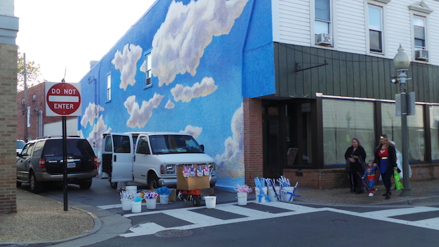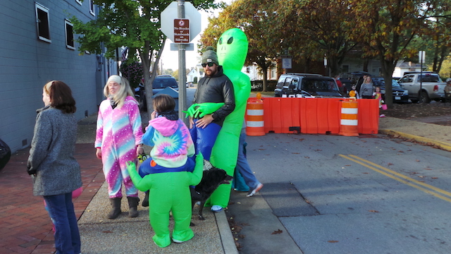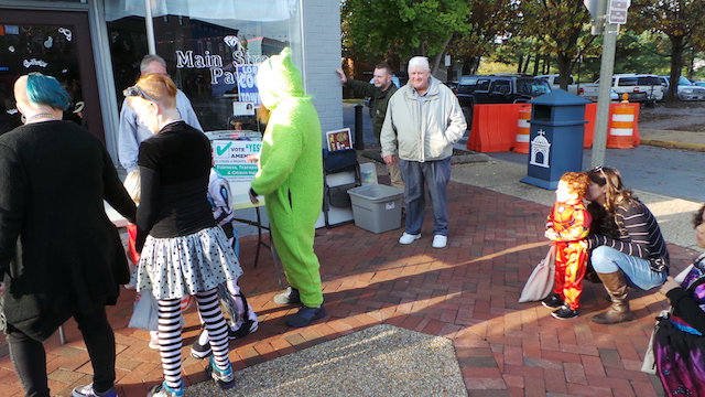 And a little further west on East Main two independent local town council candidates continued the political giving spirit. Below, moved to their respective signs during a candy break – just in case you didn’t recognize Betty Showers and Josh Ingram in costume.