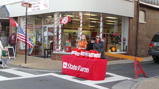 However, no pumpkin security at Ellen Aders State Farm candy distribution table next to East Main Street’s new “I Want Candy” store.