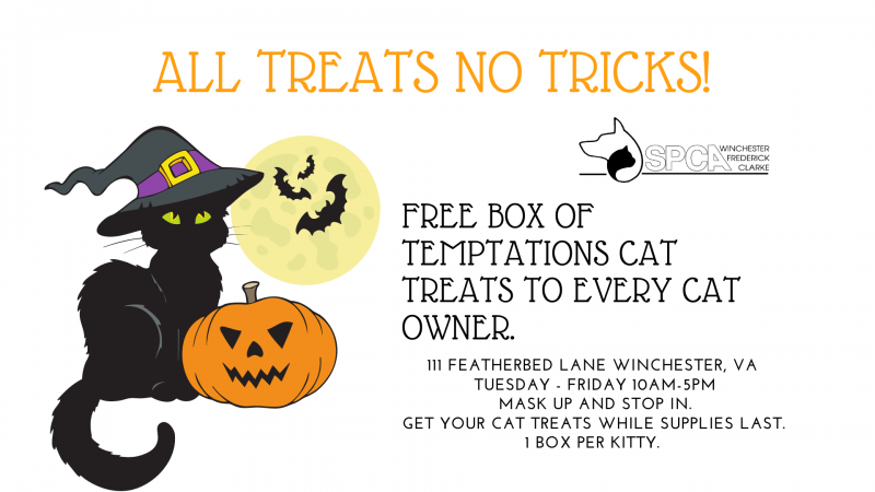 Thanks to a generous donation, the Winchester SPCA is giving away cat treats to local cat owners. Just mask up and stop by 111 Featherbed Lane in Winchester, Tuesday – Friday, 10AM-5PM, to get your kitty a box of treats while supplies last. One box per cat.
