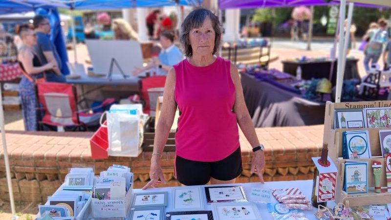 Kathy Atherton shares her handcrafted cards and beach glass art at the Christmas in July market. A Stampin’ Up demonstrator for 28 years, Atherton now teaches small card-making classes, blending creativity with community.