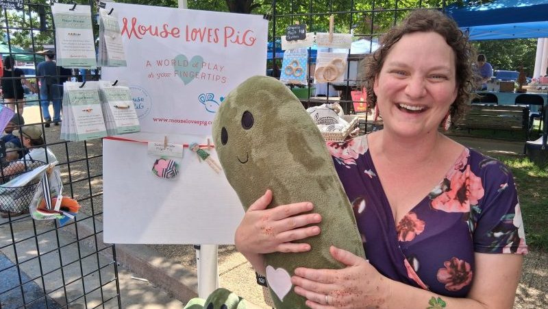 At the Mouse Loves Pig tent, Ruth Rau from Winchester shared the heartwarming story behind her handmade cloth toys. Inspired by a nightly tradition of made-up stories with her kids, the name comes from her husband’s improvised version of The Farmer in the Dell—in which a mouse, instead of taking the cheese, falls in love with a pig. “Everything is cloth, washable, and made for real play,” said Rau. “Kids need toys that feel like something—something they can love.”