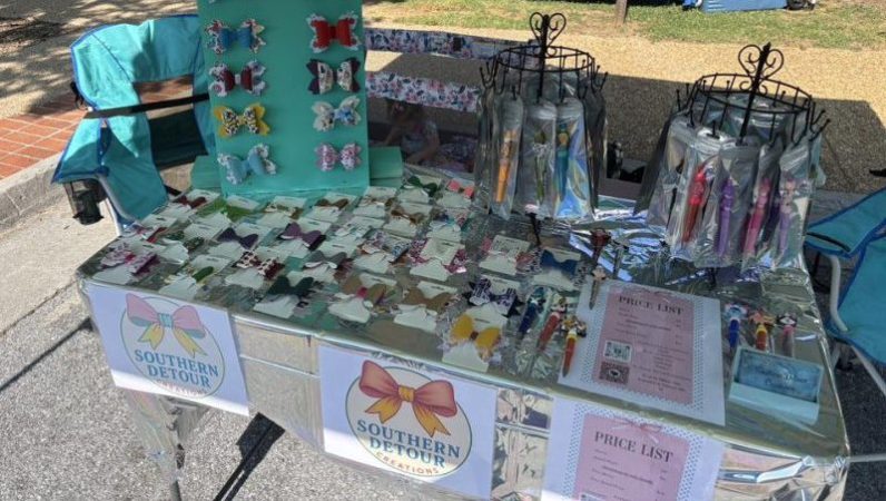 Christine Ganey stood behind her display for Southern Detour Creation, a business as unique as her journey. “I was born and raised in New York, worked at Disney World for nine years, and that was my Southern detour,” she said, laughing. Now settled in Virginia with her husband and two kids, Ganey crafts everything from faux leather hair bows and beaded pens to custom tumblers and shirts. “Basically, if you can dream it, I’ll try to make it,” she said, greeting curious shoppers who stopped to admire her brightly colored table.