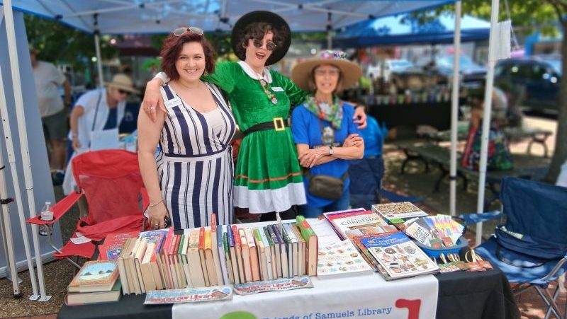 Chantal Gamble, Sydney Patton, and Pyda Gonzalez brought festive energy to the Friends of Samuels Library booth, sharing their love for reading—and wishing for a snow machine to beat the July heat.