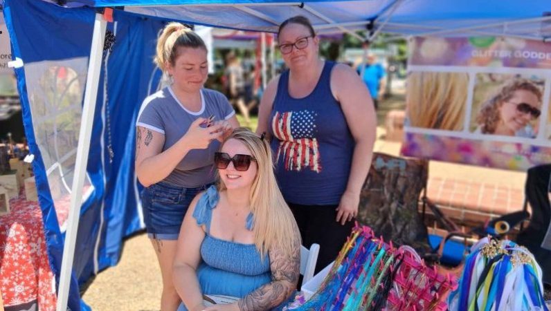 Ashley Holsinger and Kimberly Baker add a touch of sparkle with fairy hair strands for Brittany Kearns during the Christmas in July event, bringing shimmer and smiles to the celebration.